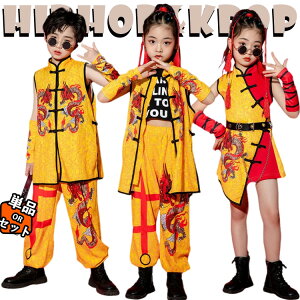 黄色 竜柄 浮世絵 キッズ ダンス衣装 男の子 女の子 かっこいい 中国 唐装 チャイナ風 ベスト おしゃれ ゴールド チャイナボタン 中華服 トップス パンツ jazz ジャズダンス ヒップ