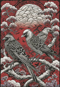 昭和レトロ 入れ墨風 部屋 アート グラフィック カラス 花 月 木 鳥 タペストリー 和風 和柄 ハロウィン ホラー ゴシック 日本画風 浮世絵風 イ