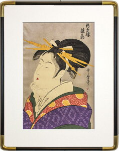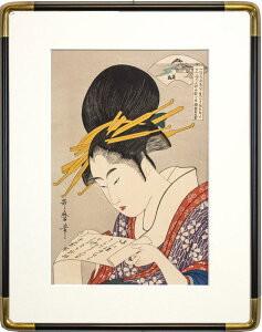 ■手紙を読む美人 美人画の第一人者である歌麿は、女性の上半身を 大きく描く「大首絵」という表現方法を考案し、 人気を博しました。 この作品は、遊女が手紙を読んでいる様子と されています。 作品をより引き立てる高