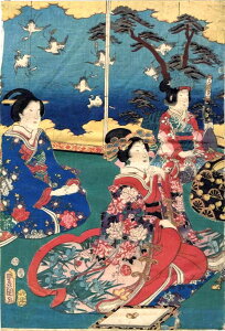 木版画(浮世絵)三枚続 作品名 風流あづま源氏 作家 歌川豊国 寸法 37×74.5cm 三代豊国は1786年に江戸で生まれ1865年に没した 制作の最盛期からは約二百年近くが経過しているものの、世に出された数の多さから...