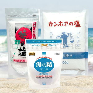 三大人気天日塩セットです。 【セット内訳】 カンホアの塩 石臼挽き 500g×1個 海の精 ほししお(青)120g ×1個 あまぎ食品 徳の塩 150g ×1個 ●カンホアの塩 石臼挽き 500g ベトナム...