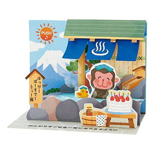 サルが温泉にのんびりとつかっている、ほっこり癒やされるカードです。 ボタンを押すと、思わず口ずさみたくなるお風呂の名曲「いい湯だな」が流れます。 立てて飾ってお楽しみいただけます。 カードの裏側にメッセージスペースがあり