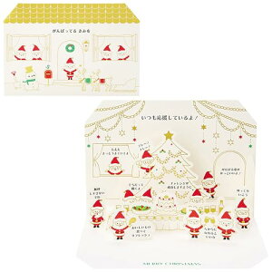 カードを開くと、クリスマスパーティー中のサンタたちが立ち上がり、たくさんの応援メッセージを伝えます。 すみずみまで見てお楽しみいただけるポップアップカードです。 金箔の線で描かれています。 赤い封筒付き。