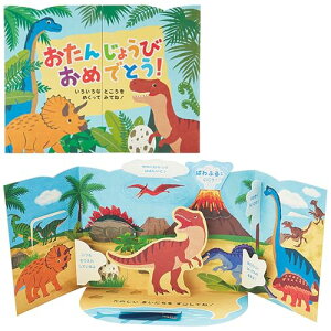 カードを左右に開くとティラノサウルスが立ち上がり、恐竜の世界が広がります 雲や草木、岩、卵などをめくると「おおきくなったね!」「げんきいっぱいあそぼう」などのメッセージが出てきます。 カードを開いた状態で立てて飾れます