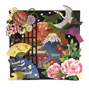 商品の特徴 たくさんの和風モチーフのパーツと風景をコラージュ風にミックスした、ギフトボックスのようなカードです。 豪華かつ繊細なデザインが魅力です。季節を問わずお贈りいただけます。 全体にレーザーカットと金箔加工が施され