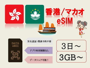 【商品特徴】 (1)対応地域:香港/マカオ対応 (2)データプラン:3GB、5GB、10GB、30GB (3)ご利用日数:3日、5日、7日、10日、15日,、30日 (4)データ制限:ご利用データ量がご注文のプランを超える場合、残りの...