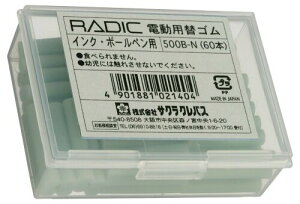 サクラクレパス 電動消しゴム用替ゴム インク・ボールペン用 60本入 500B-N 【用途】インク・ボールペン用 【仕様】砂ゴムタイプ 【特長】紙面上のボールペンインクを消す 【単品サイズ】Φ4.6×20mm/本...
