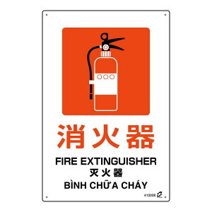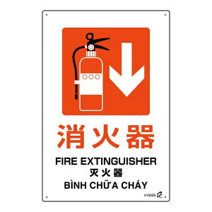 建設業労働災害防止協会の建設現場用安全標識に関する指針に基づく安全標識です。●日本語、英語、中国語、ベトナム語の4カ国語が併記されています。●当該情報の明示(指示)に。【仕様】●表示内容:消火器●取付仕様:穴4ヵ