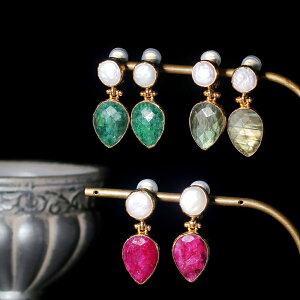 希少な22金アンティークゴールド塗装。余裕がある大人のセンスすら感じさせるデザイン。二粒が嬉しい淡水パールと天然石のチャーム。