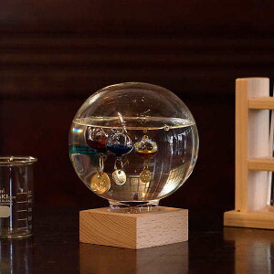 有名なニュートンのりんごを連想させつつ、どこかメルヘンなムードも持ち合わせたインテリア性の高いガラスフロート温度計。通称“ガリレオ温度計”の名前でも知られ、気温によって液体の比重が変化することから、ガラス球体の浮き沈