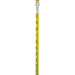 特長:表面は10mmごとに読み取りやすい目盛線になっており、50mm毎に赤い目盛線になっています。表面は1mごとに本体の色が黄・白の交互になっており、遠くから見てもすぐに何mなのか分かりやすくなっています。裏面は基準から1mmピッチの