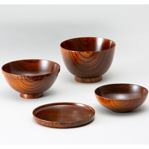 杢目の美しい天然木・ケヤキを用い、漆塗りで仕上げた和の食器4点セット。汁椀の中に飯椀、飯椀の中に小鉢がスッキリ収まり、その上に蓋を兼ねた取皿がキッチリと重なってコンパクトに収納できます。食事の際は食器棚からコレひとつを