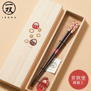 【一双】吉兆桐箱 箸置付 夢だるま縁起物のだるまがあしらわれたお箸。天然木に漆を塗り重ねた若狭塗箸に、縁起の良い絵柄をあしらった桐箱付きのペアセット。● サイズ :箸23cm 箸置約4.4×2.4cm...