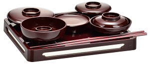 現代のコンパクトなお仏壇に合わせたミニサイズの一体型仏膳です。飯椀(ご飯入れ)、汁椀、平椀、高月、壺椀が一体となったお膳とお箸がセットになっています。この製品のみで、お供え時に必要なひととおりの仏具用品小物がそろいます