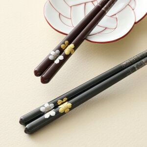 金と銀のかわいらしい桜が二輪ずつ添えられた上品なお箸です。塗りは漆で仕上げられており、美しい光沢が楽しめます。食い先にはすべり止め加工が施されているので、お料理をしっかり滑らずつまむ事ができます。華美すぎず...