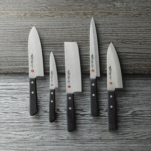 [商品名]古流梨地包丁5点セット 代引き不可商品です。代金引換以外のお支払方法をお選びくださいませ。古流梨地包丁5点セット濃州孫六作の伝統を受け継いで1丁ずつ作られた銘品です。伝統的な梨地模様の古流仕上げの包丁です。●材質:ス