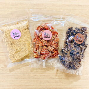 ひとくちささみ、ささみふりかけ、砂肝 各100g 1袋ずつ ひとくちささみ 低脂肪&高タンパクで太りにくく、ダイエット中のわんちゃんにもおすすめのヘルシーおやつです。 材料: 完全無添加☆日本国内で飼育
