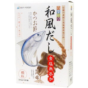 商品名 四季彩々 和風だし 内容量 3.5g×30包 成分 かつお節、甜菜糖、酵母エキス、昆布、椎茸 賞味期限 パッケージに記載 保存方法 高温多湿を避け、涼しい所に保存し、なるべくお早めにお召し上がりください...