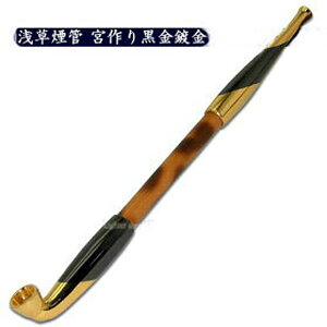 浅草煙管元禄黒金色鍍金(あさくさぎせるげんろくくろきんしょくめっき) 特徴:雁首と吸い口は、金色鍍金と烏金(カラスがね)色の塗装を組み合わせた真鍮製。古い時代の上物の煙管によく見られる伝統的な模様を再現...