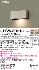 LGW46146YLE1LGW46146YLE1屋外灯 門柱灯・表札灯 LED 自動点灯無し電気工事必要 畳数設定無し壁直付型 LED(電球色) 表札灯 拡散タイプ 防雨型 白熱電球10形1灯器具相当器具分類...
