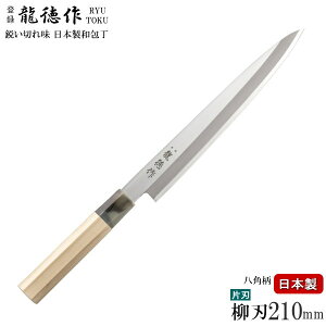 龍徳作 日本製和包丁シリーズ -【 柳刃包丁 】- ●ご家庭でのお刺身用に。お刺身がきれいに切れる刃渡りの長い包丁です。 ●包丁部はお手入れしやすく錆びにくく、刃こぼれしずらいステンレス刃物鋼を使用。 ●桂部はマーブル