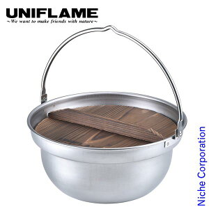 ユニフレーム 焚き火鍋26cm[659991]▼焚き火で使いやすいステンレス製ツル付き鍋ファミリー向けサイズ。●風合いのある天然木の木ブタ。■仕様【サイズ】約Φ26×12(高さ)cm(ツル外寸幅約28.5cm)【材質】本体・ツル:ステ...