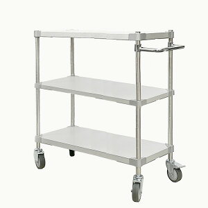 【商品説明】 ステンレス製キッチンワゴン。 キャスターが付いているためお好きな場所まで移動し、調理スペースとして使えます。 中棚は5cmの高さ調整可能。 天板の四隅には保護キャップ付き。 【サイズ】 本体:約幅7