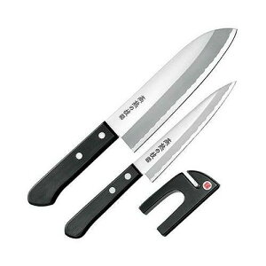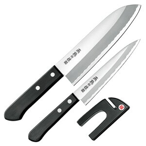 【商品詳細】・肉、魚、野菜などオールマイティに使える三徳包丁。・果物の皮むきや飾り切りなどに便利なペティナイフ。・切れ味をいつでも保てるミニ砥ぎ器。・刀身はさびにくく、お手入れのしやすいステンレス刃物鋼を採用...