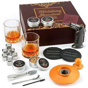 スモーカー キット ウイスキー グラス付き, 20点 木製ウイスキースモーカー セット, スモークヘッド 燻製器 燻製キット トーチ付き, アイスキューブ溶けない氷 4種類のウッドチップ, 燻製酒ドリンク愛好家,...