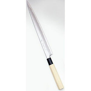 33cm 全長485mm 240g 背厚4.9mm料理人がもっとも好む鋼です。職人でも焼入れが難しく、正確に焼入れができれば他の鋼に負けない硬度と粘り強さが得られ、切れ味の良い庖丁です。AZT2405