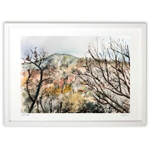 【作家からの作品説明】静かな冬の山あいに佇む小さな家。やわらかな光に包まれた山の風景を描いた一枚です。冬を迎える静かな森の中、小さな家がぽつんと佇む姿が心を和ませます。穏やかな色合いと繊細なタッチが、お部屋にやすらぎ