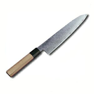 堺孝行 日本鋼(ツバ付)(1)牛刀 240mm(15013) 日本鋼(ハガネ)を使用した、堺孝行の中で最もポピュラーな包丁です。よく切れますが、サビは出ますのでお手入れ良くお使いください。