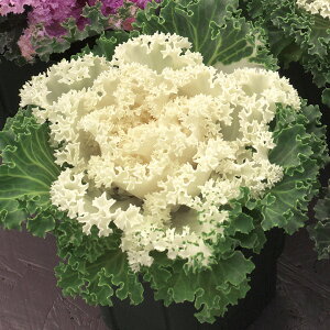 お正月を彩る花材として欠かせない矮性葉牡丹です。ミニ仕立てにしたり大型に育てたりと魅力いっぱいです。着色部がしろ色に染まり、外葉の濃緑色とのコントラストが美しいです。プロも愛用する作り易い品種です。