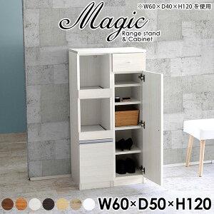 magic レンジ台×キャビネット W60×D50×H120 木目サイズサイズ:約幅600 奥行き500 高さ1200 mm材質[天板・スライド棚]メラミン樹脂化粧合板[前板]ブラウン・ダークブラウン・チーク/デルナチュレ化粧合板ホワ...