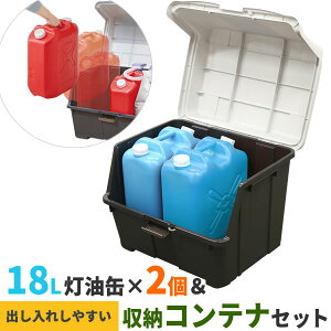 屋外収納コンテナと灯油用ポリタンク18L×2個のセット。灯油缶が出し入れしやすい重い灯油缶を出し入れする際、高く持ち上げる必要がないので収納ラクラク。身体的負担を軽減します。