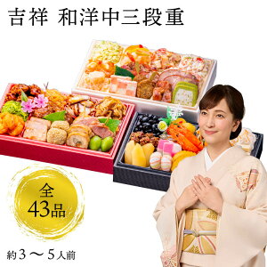 商品名:和風、洋風、中華の食材を三段重に分けて盛り込みました。 商品名:「吉祥」和洋中 三段重 おせち 内容量:【壱の重】味付け数の子、金胡麻マグロ甘露煮、黒豆、栗甘露煮、パリパリ松前漬け、にしん大漁漬け...