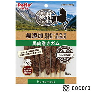 ・噛みごたえ抜群で、噛めば噛むほど馬肉の旨味が楽しめます。 ・着色料・保存料・発色剤・酸化防止剤無添加。 ●原材料 肉類(馬・馬レバー)、牛皮、加工でんぷん、グリセリン、ソルビトール