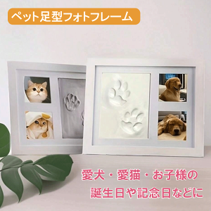 専用の粘土に足型を押すだけで、世界に一つだけの足跡を記録できるペット足型フォトフレームです。足型と一緒に2枚写真を飾れるので、可愛い姿と足型を並べてインテリアとして楽しめます!