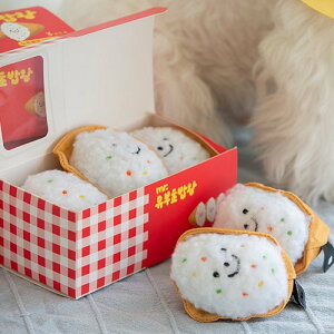 箱の中に3つの "おいなりさん" が詰まったおもちゃセット★ ふわふわのおむすびの中にはピーピー音の鳴り笛が入っています。 いなりの皮とおむすびはマジックテープで着脱することができ、おやつが隠せます♪ 知育トイとしての遊び方 [1