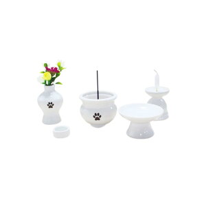【商品説明】天国へ旅立ったペットちゃんのための仏壇用小物8点セット。家族でいてくれた大切な日々の思い出のあかしにどうぞ【セット内容】・ローソク皿×1・香皿×1・供物皿×1・水入れ×1・花立×1・ローソク立×1・香立×1・造花×1※上記
