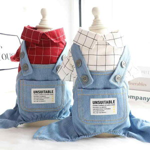 かわいい犬のデニムのジーパンの連体の服、ファッション的なスーツ、四脚の服、小型犬、猫に適します。 柔らかくて快適な純綿の生地です。暖かくて、通気性がよくて、春夏の季節に適しています。 シンプルなストライプのシャツ、無地の木綿のデニムの...