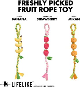 ロープについているフルーツが着脱可能。 ロープとして引っ張りっこは勿論 フルーツを外して投げて遊ぶのも◎ 上部の輪っか部分はワンちゃんも咥えやすく、 人も握りやすい仕様。 下部の葉っぱモチーフはぬいぐるみが 抜けないためのス