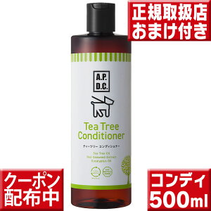 APDCティーツリーコンディショナー 犬用 500ml。原材料ティーツリーオイル、紅藻エキス、ヒアルロン酸ナトリウム、ユーカリオイル、ローズマリーオイル、ラベンダーオイル、シトロネラオイル、ビタミンE、香料、保存料。
