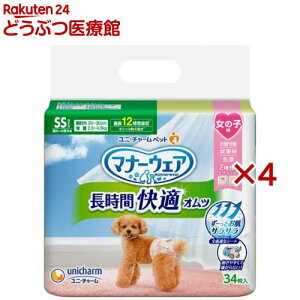 お店TOP>ペットシーツ・犬のトイレ用品>マナーウェア>マナーウェア 長時間快適オムツ 女の子用SS 犬用 (34枚入×4セット)【マナーウェア 長時間快適オムツ 女の子用SS 犬用の商品詳細】●長時間使用しても快適な女の子用の紙オム...