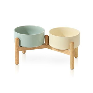 【送料無料】陶器製 犬フードボウル 850ml ゴムの木製スタンド付き 滑り止め 中型犬向け 水飲み皿・ご飯皿 ペット食器 餌入れ (クリーム+ライトグリーン, S)ブランド色クリーム+ライトグリーンモデルJ...