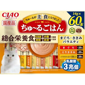 ちゅ〜るが主食になりました! ・猫ちゃんに必要な栄養素をバランスよく配合した総合栄養食 ・毛玉配慮、お腹・歯ぐき、皮膚の健康に配慮した素材を配合 ・2種類の味が楽しめるバラエティパック 【エネルギー】約12kcal/本