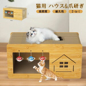 【2-in-1キャットハウス兼爪とぎベッド】縦横両方向に使える猫用ハウスで、爪とぎ板としても使えます。木目調でおしゃれなデザインで、猫の隠れ家としても最適です。猫ちゃんが快適に過ごせるサイズで、小窓から外を眺めることもできま