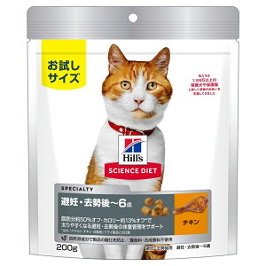 商品の特徴 日本ヒルズ・コルゲート サイエンス・ダイエット猫用避妊去勢用避妊・去勢後-6歳チキン 200g ●太りやすくなる避妊・去勢後の体重管理と健康をサポート 【対象種類】全種 【対象年齢】全ステージ...