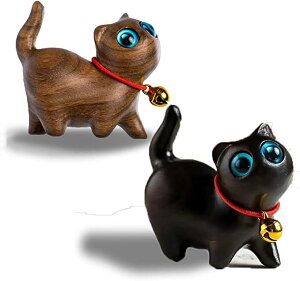 【自然の美】木から彫ら自然の美 ,天然素材で精巧に作られています:手作り可愛い招き猫。すべての招き猫は体に小さな鐘を持っています。祝福を伝える,いいことたくさんありますように… 【セット内容】黒猫*1 褐色猫*1 黒猫(目無