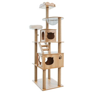 ぺラ) キャットタワー 木製 猫タワー ハンモック 爪とぎ 木目調 スリム 大型猫 据え置き シンプル 省スペース 天然麻紐 見晴台 おしゃれ ねこハウス ねこのおもちゃ 運動不足解消 多頭飼い - ベージュ...